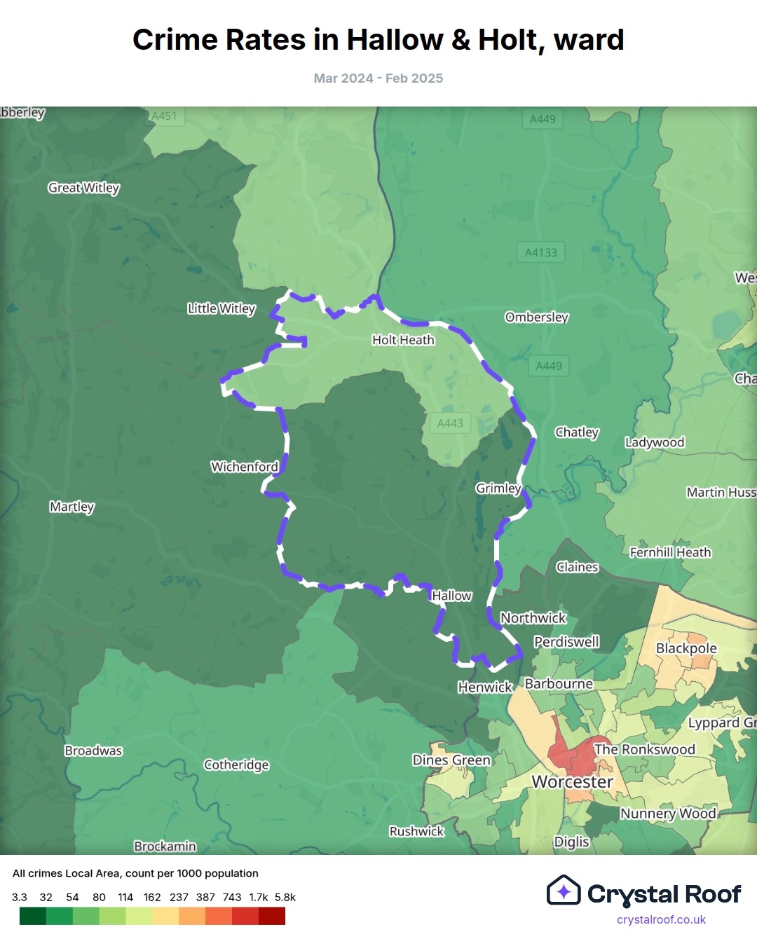 Hallow & Holt, (ward) includes areas with the following crime ratings (see map):