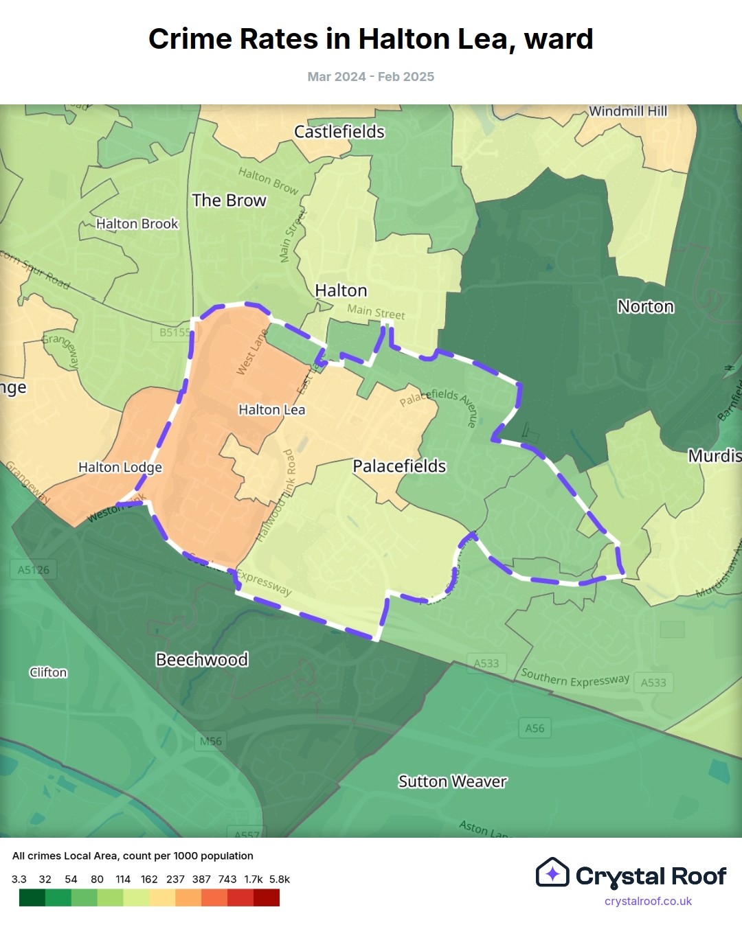 Halton Lea, (ward) includes areas with the following crime ratings (see map):