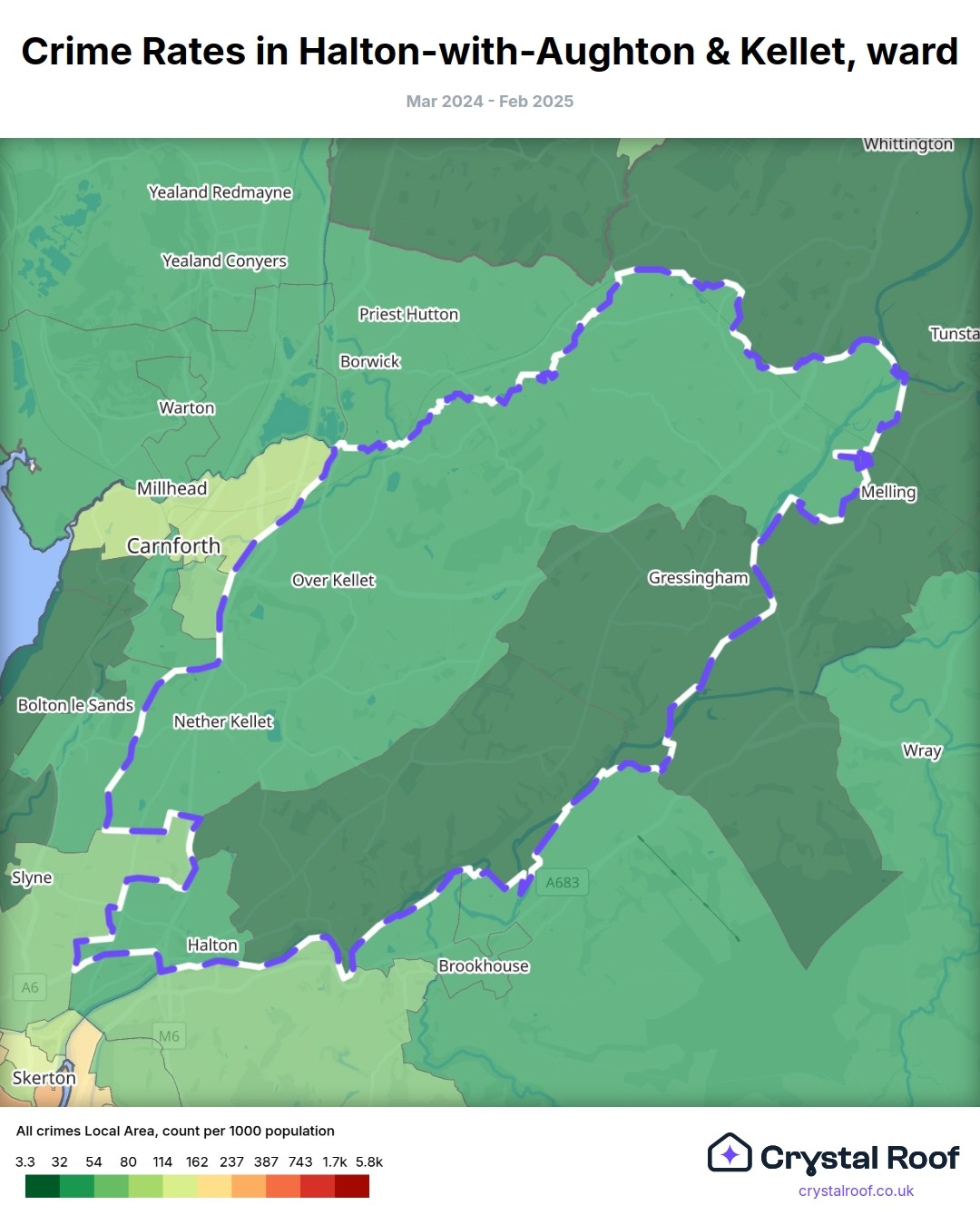 Halton-with-Aughton & Kellet, (ward) includes areas with the following crime ratings (see map):