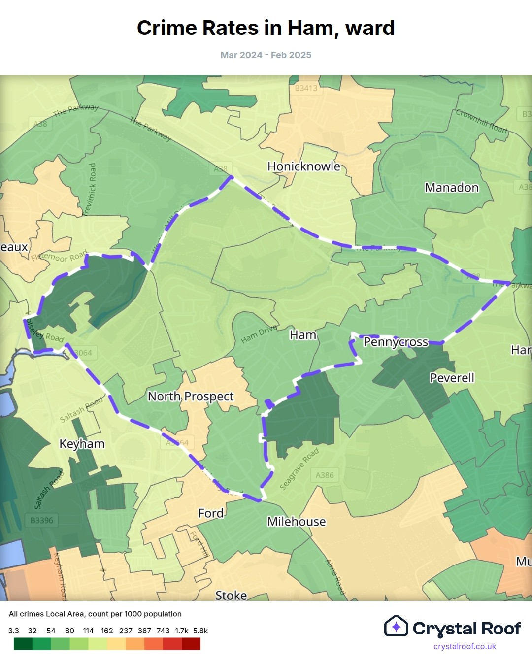 Ham (ward) is located within Plymouth (borough). Annual total crime rate in Plymouth (borough) is 114 crimes per thousand resident population, which can be rated as 5 out of 10 or medium crime level compared to other local authority districts in England and Wales.