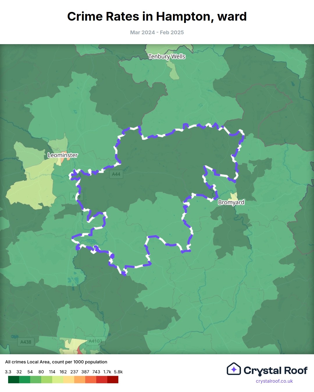 Hampton (ward) is located within Herefordshire, County of (borough). Annual total crime rate in Herefordshire, County of (borough) is 63.5 crimes per thousand resident population, which can be rated as 2 out of 10 or low crime level compared to other local authority districts in England and Wales.