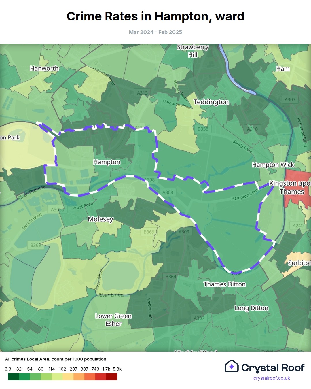 The figures in grey indicate the relative ratings of Hampton (ward) for a specific crime type compared to other wards in England and Wales.