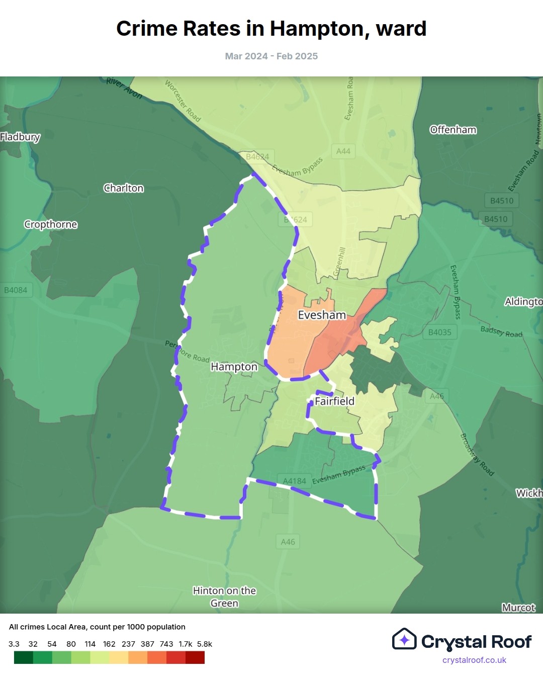 Hampton (ward) is located within Wychavon (borough). Annual total crime rate in Wychavon (borough) is 69.1 crimes per thousand resident population, which can be rated as 2 out of 10 or low crime level compared to other local authority districts in England and Wales.