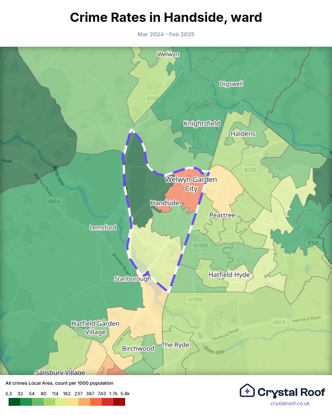 Handside (ward) is located within Welwyn Hatfield (borough). Annual total crime rate in Welwyn Hatfield (borough) is 103 crimes per thousand resident population, which can be rated as 5 out of 10 or medium crime level compared to other local authority districts in England and Wales.