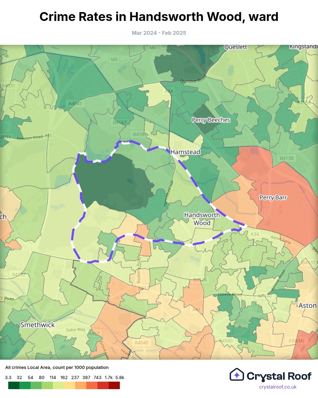 The figures in grey indicate the relative ratings of Handsworth Wood (ward) for a specific crime type compared to other wards in England and Wales.