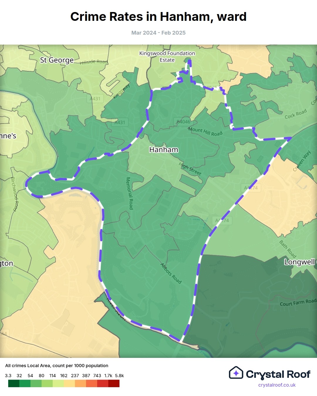 Hanham, (ward) includes areas with the following crime ratings (see map):