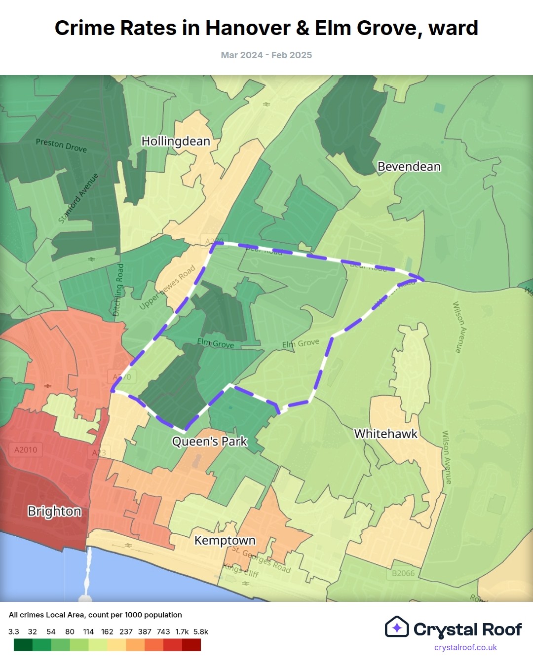 Hanover & Elm Grove, (ward) includes areas with the following crime ratings (see map):