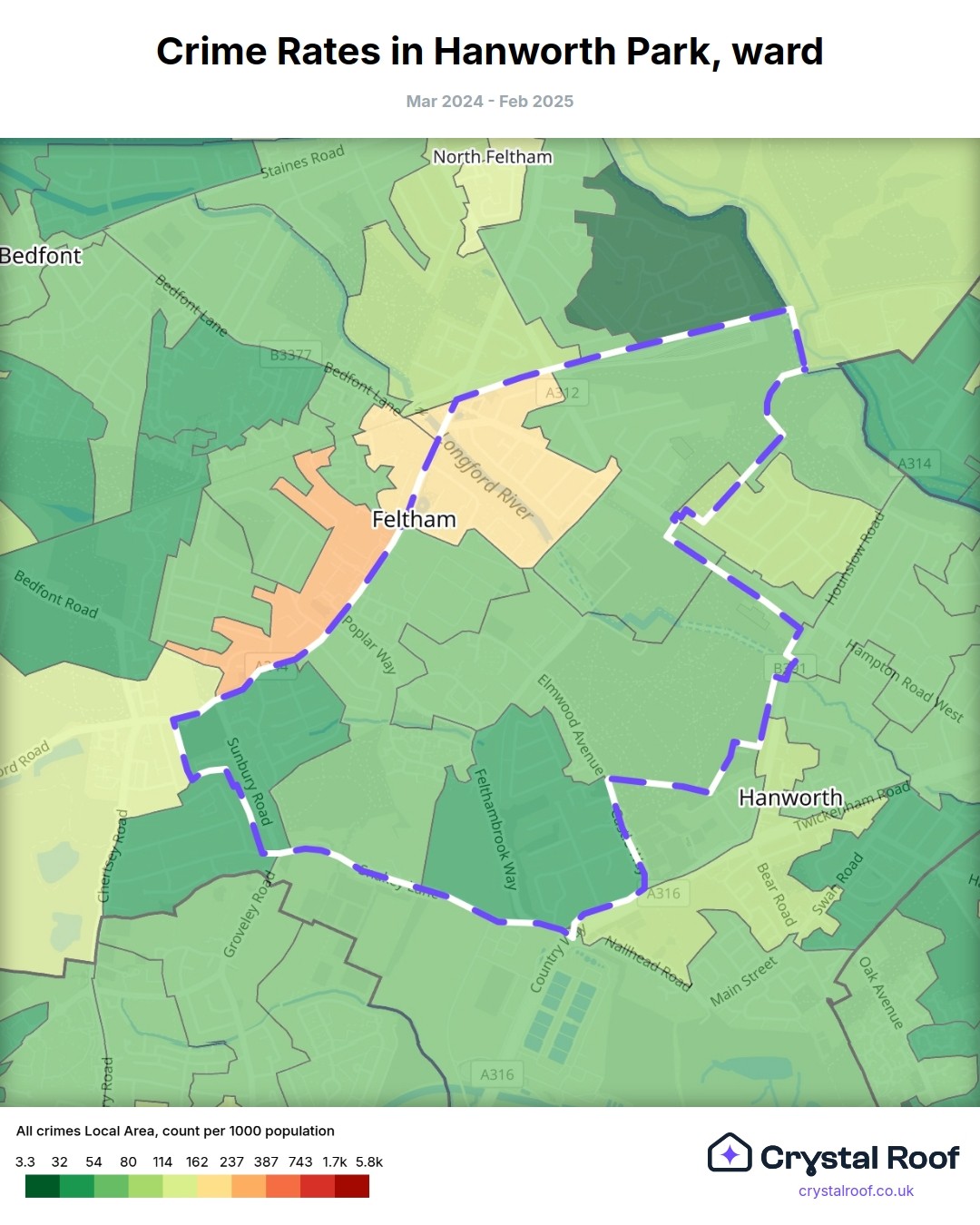 Hanworth Park, (ward) includes areas with the following crime ratings (see map):