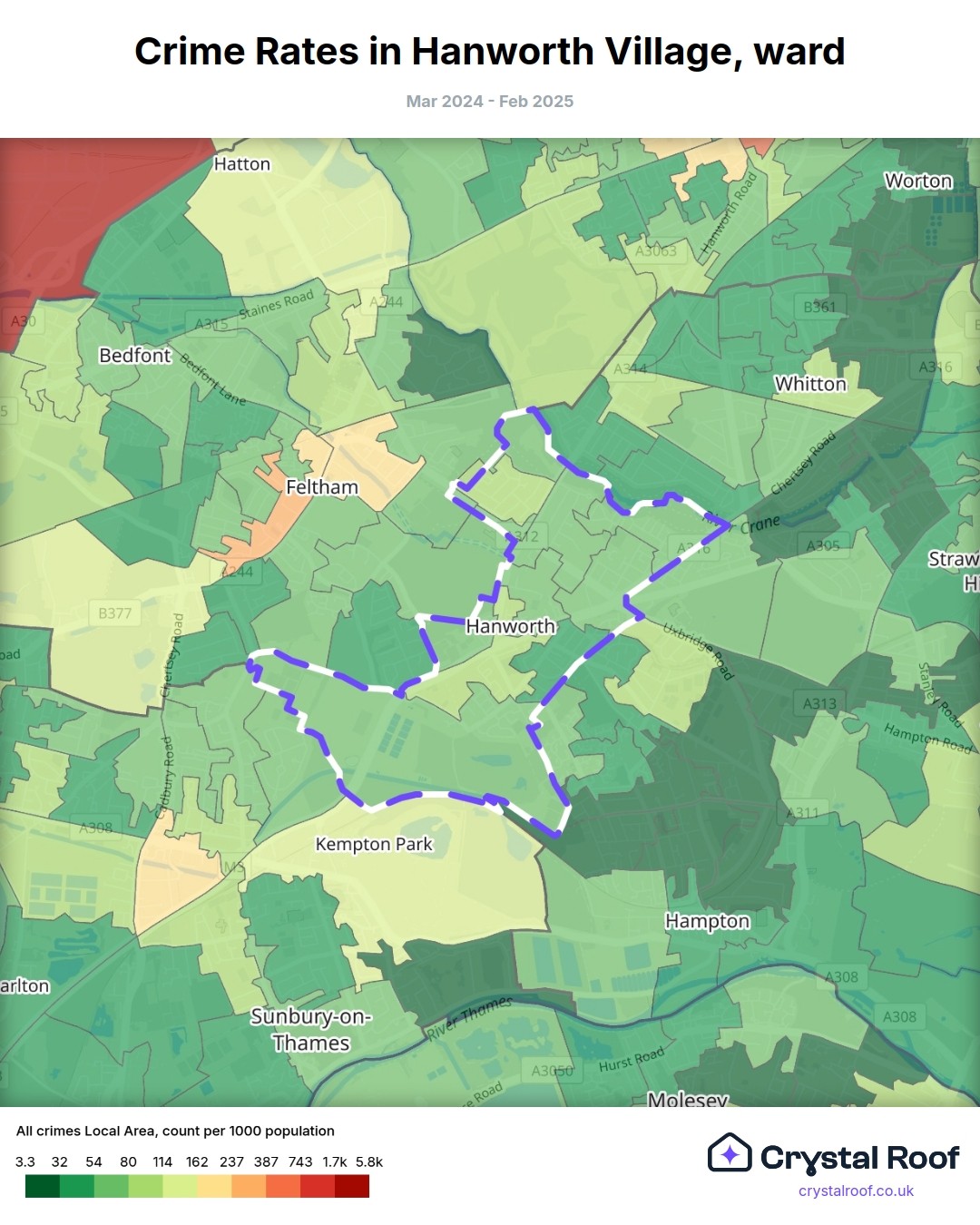 Hanworth Village, (ward) includes areas with the following crime ratings (see map):