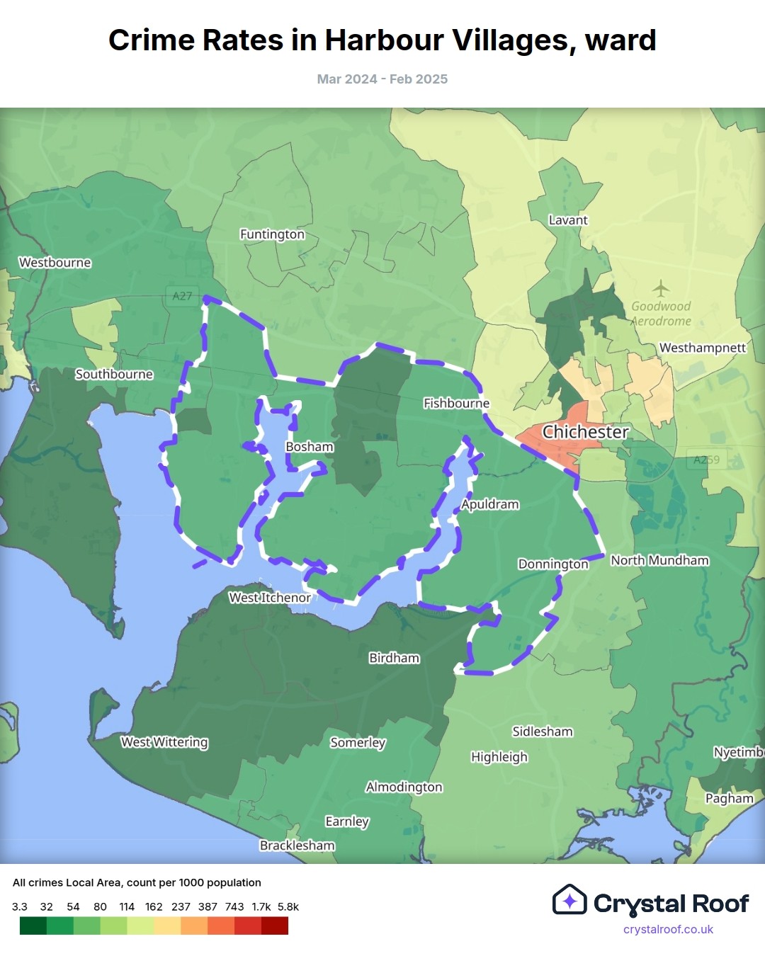 Harbour Villages (ward) is located within Chichester (borough). Annual total crime rate in Chichester (borough) is 74.2 crimes per thousand resident population, which can be rated as 3 out of 10 or low crime level compared to other local authority districts in England and Wales.