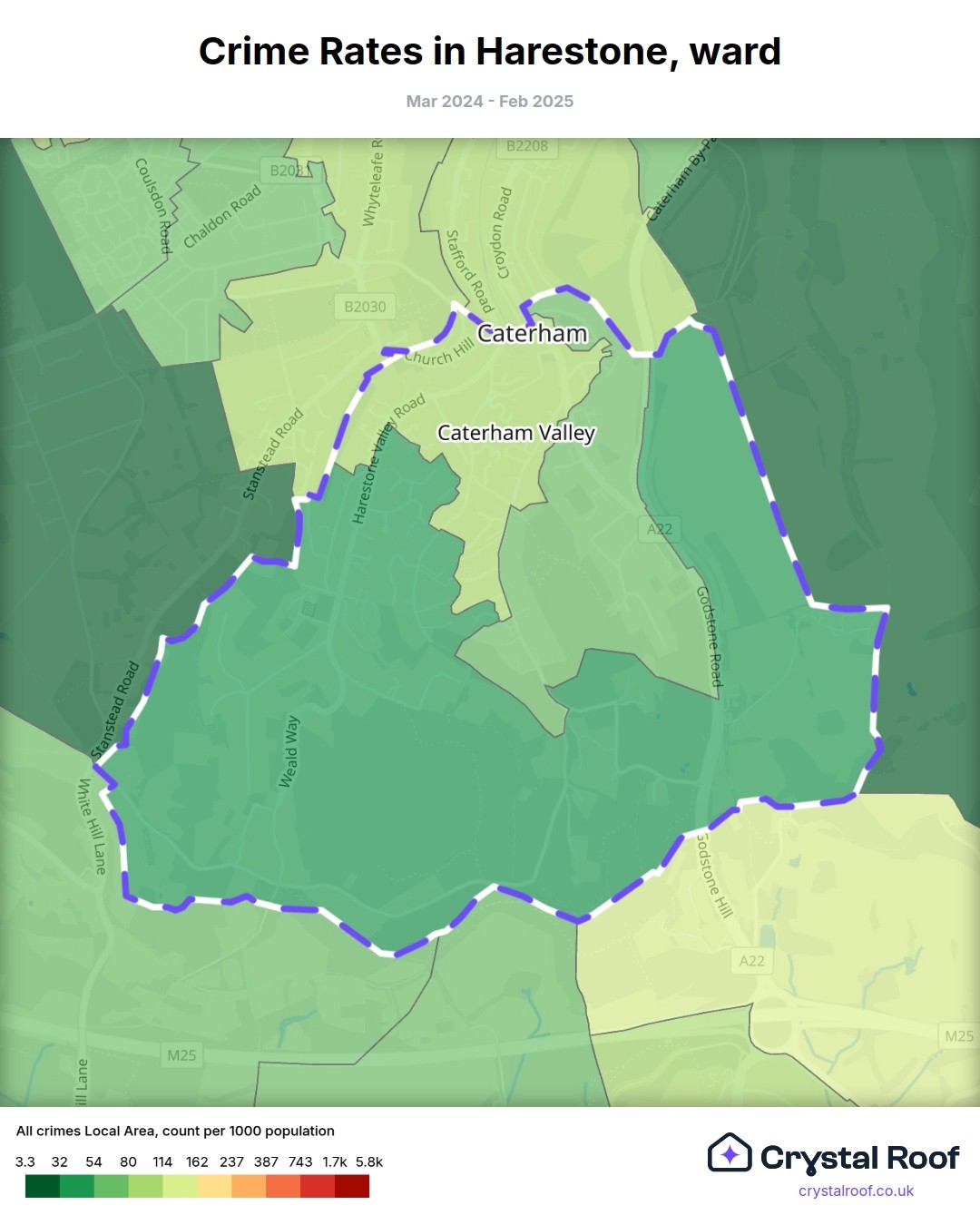 Harestone (ward) is located within Tandridge (borough). Annual total crime rate in Tandridge (borough) is 70.9 crimes per thousand resident population, which can be rated as 2 out of 10 or low crime level compared to other local authority districts in England and Wales.