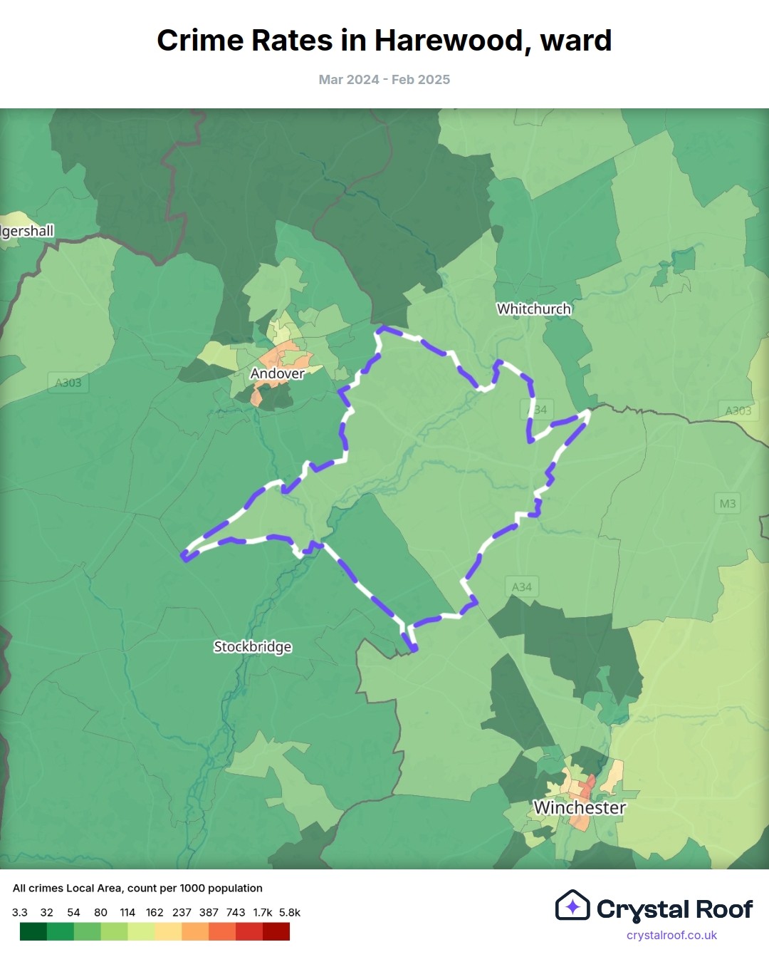 Harewood (ward) is located within Test Valley (borough). Annual total crime rate in Test Valley (borough) is 63.4 crimes per thousand resident population, which can be rated as 2 out of 10 or low crime level compared to other local authority districts in England and Wales.