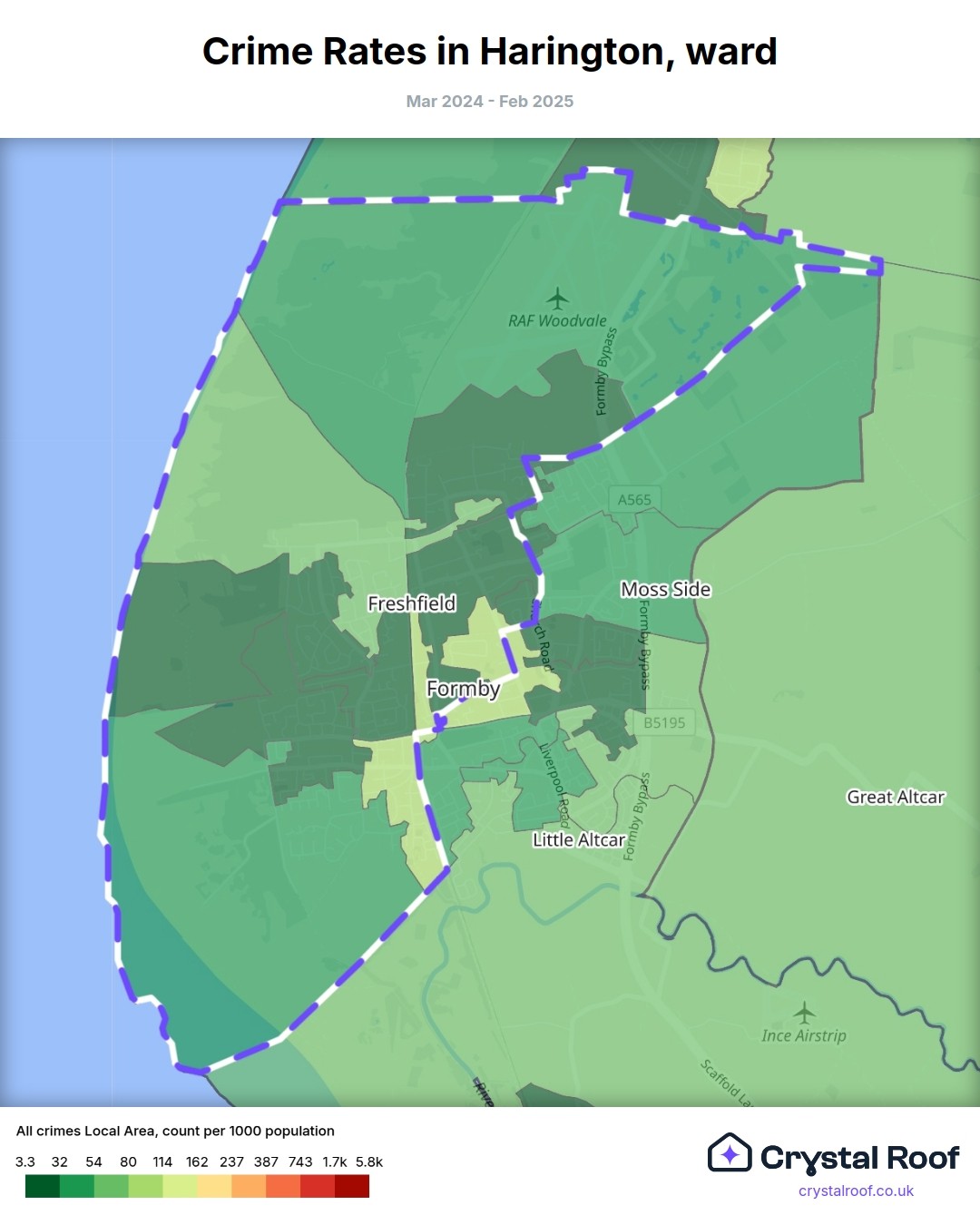 Harington (ward) is located within Sefton (borough). Annual total crime rate in Sefton (borough) is 86.3 crimes per thousand resident population, which can be rated as 4 out of 10 or low crime level compared to other local authority districts in England and Wales.