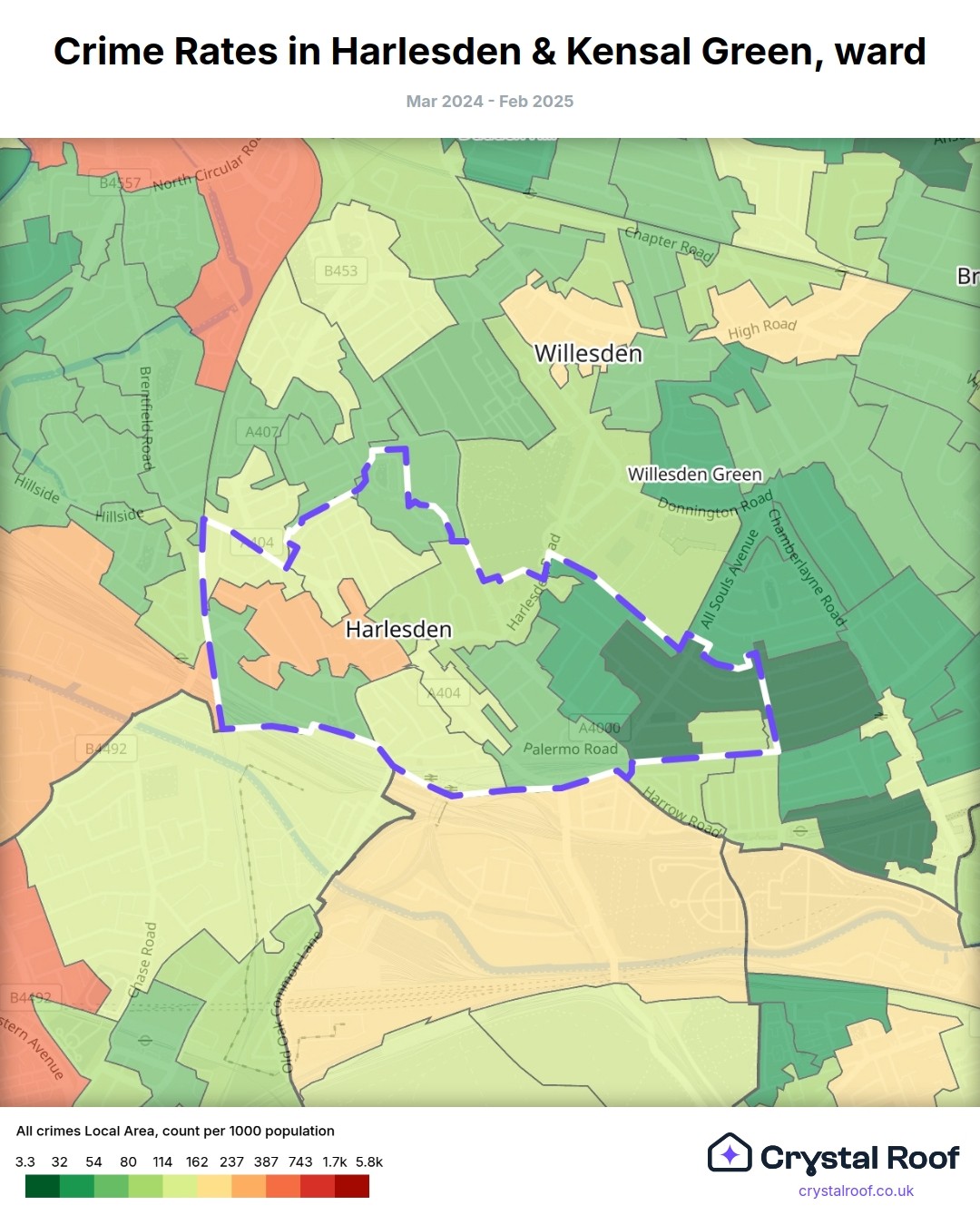 The figures in grey indicate the relative ratings of Harlesden & Kensal Green (ward) for a specific crime type compared to other wards in England and Wales.