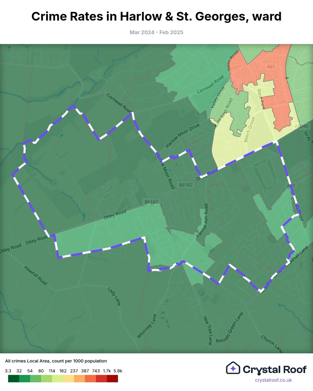 Harlow & St. Georges, (ward) includes areas with the following crime ratings (see map):