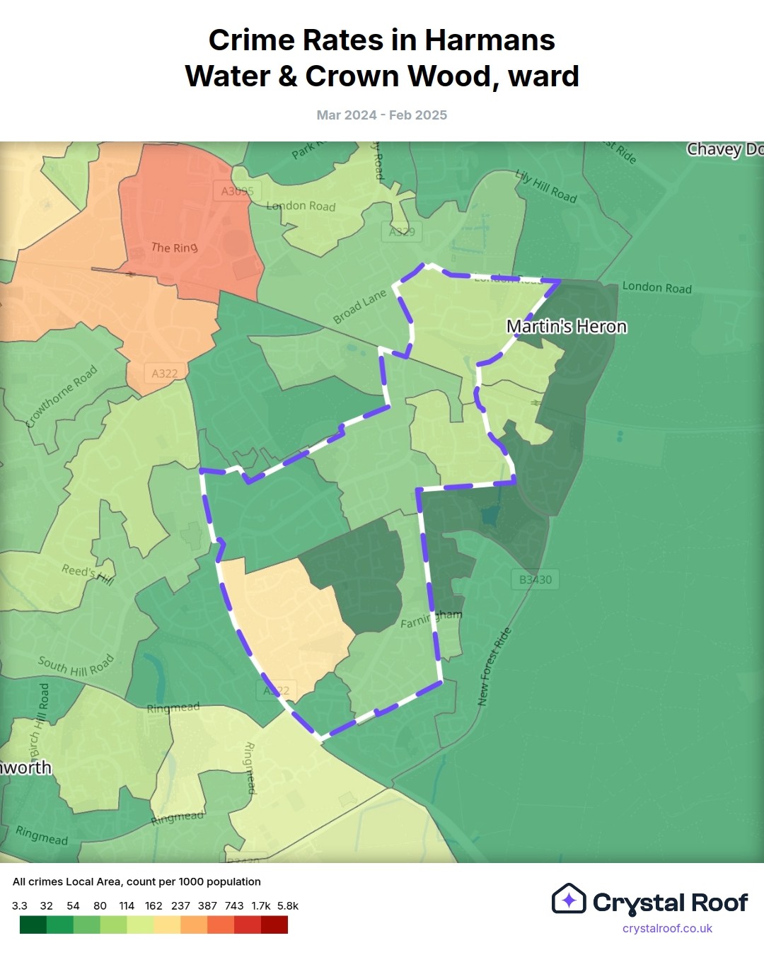 Harmans Water & Crown Wood, (ward) includes areas with the following crime ratings (see map):