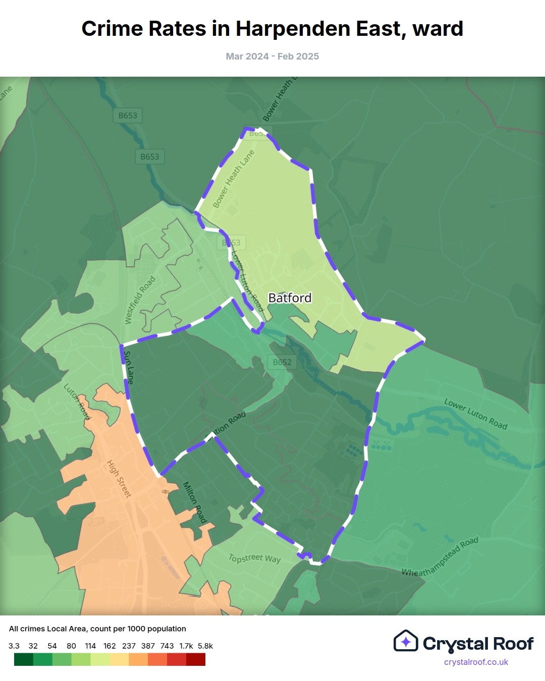 Harpenden East, (ward) includes areas with the following crime ratings (see map):