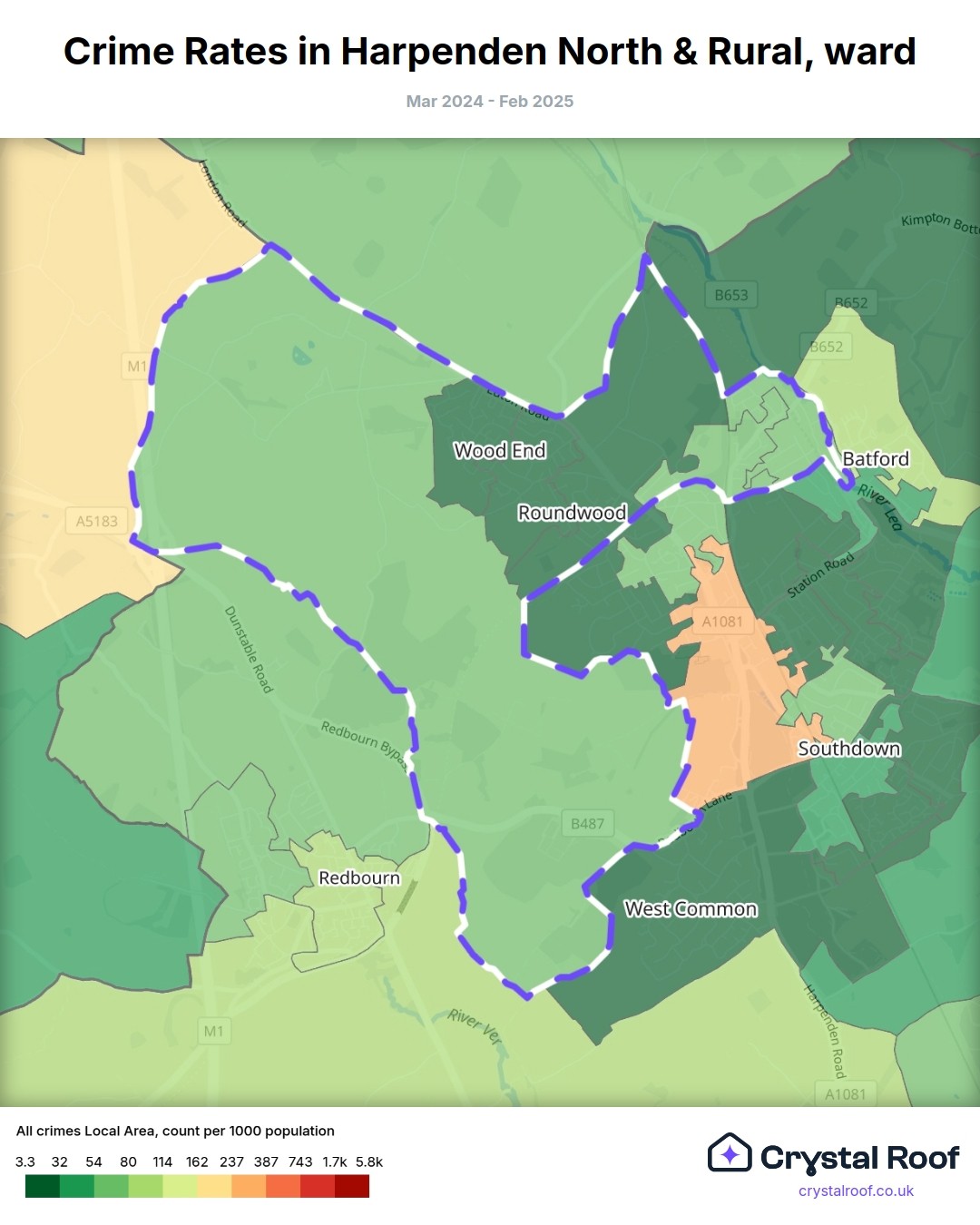 Harpenden North & Rural, (ward) includes areas with the following crime ratings (see map):