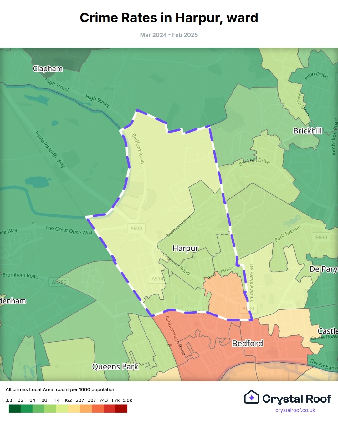 Harpur (ward) is located within Bedford (borough). Annual total crime rate in Bedford (borough) is 96.2 crimes per thousand resident population, which can be rated as 4 out of 10 or low crime level compared to other local authority districts in England and Wales.