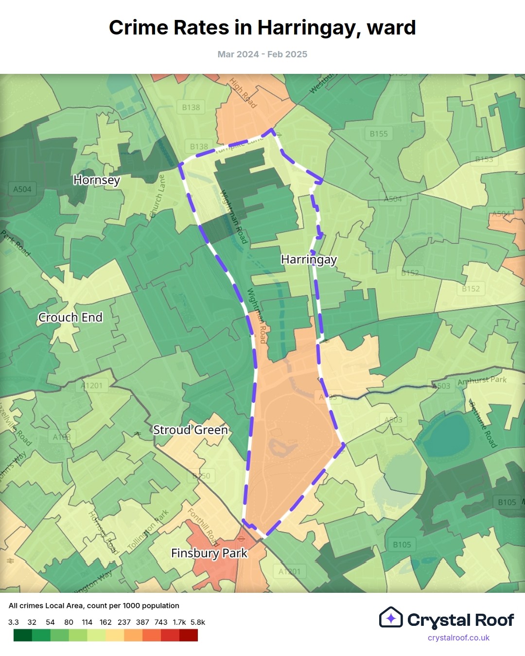 The figures in grey indicate the relative ratings of Harringay (ward) for a specific crime type compared to other wards in England and Wales.