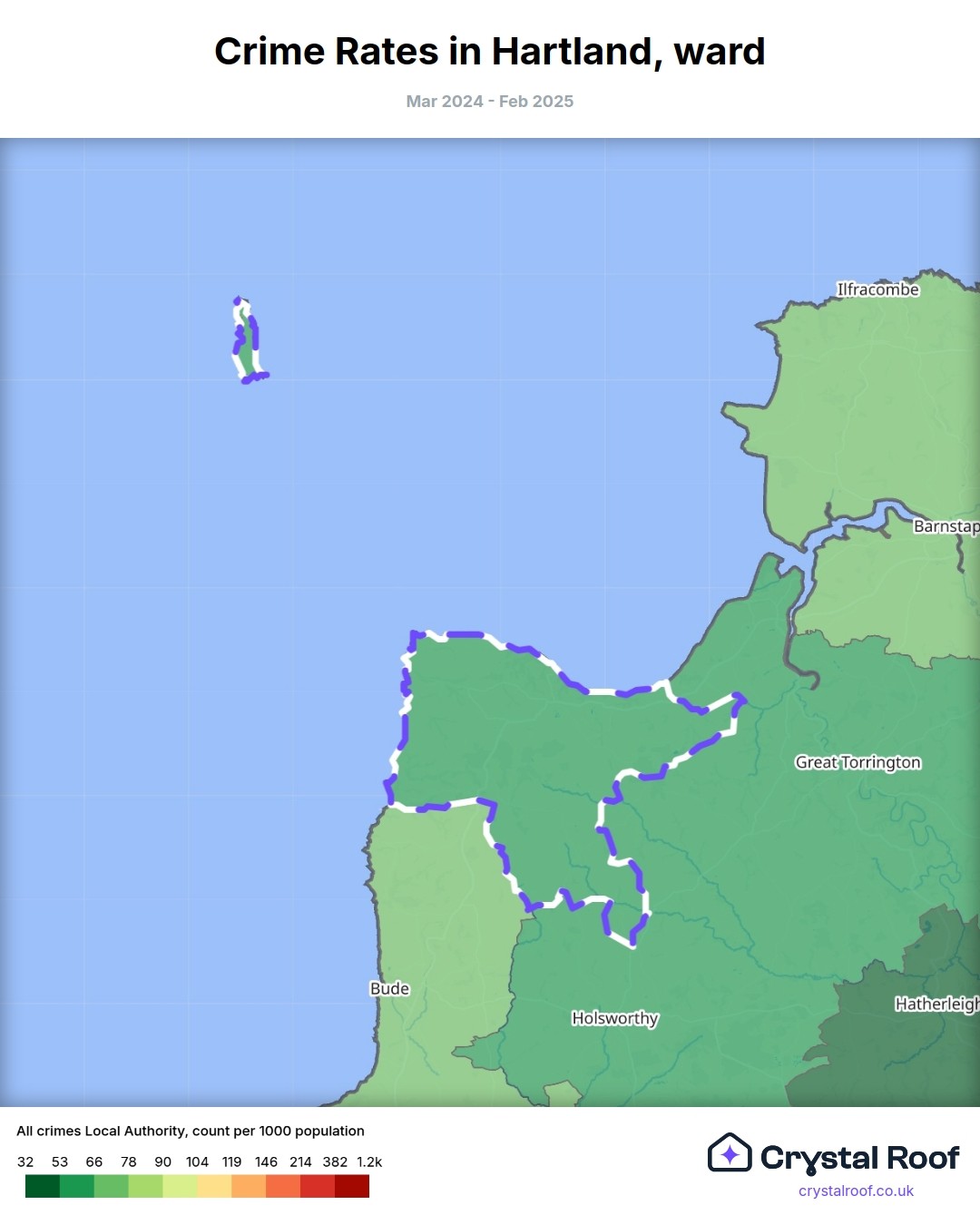 Hartland (ward) is located within Torridge (borough). Annual total crime rate in Torridge (borough) is 57.8 crimes per thousand resident population, which can be rated as 2 out of 10 or low crime level compared to other local authority districts in England and Wales.