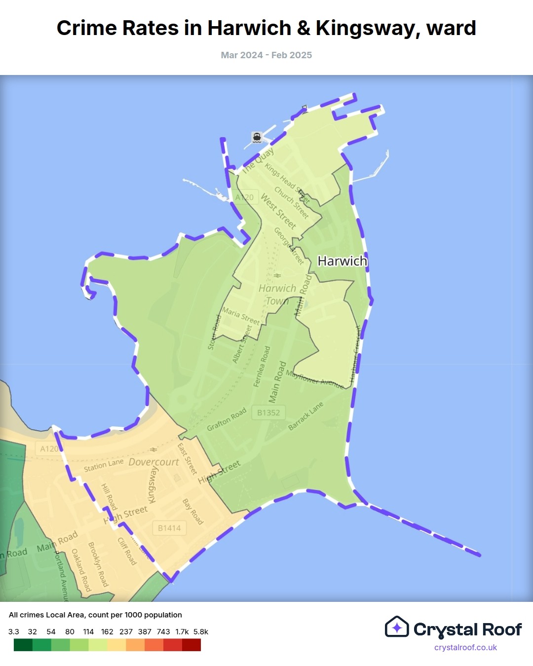 Harwich & Kingsway, (ward) includes areas with the following crime ratings (see map):
