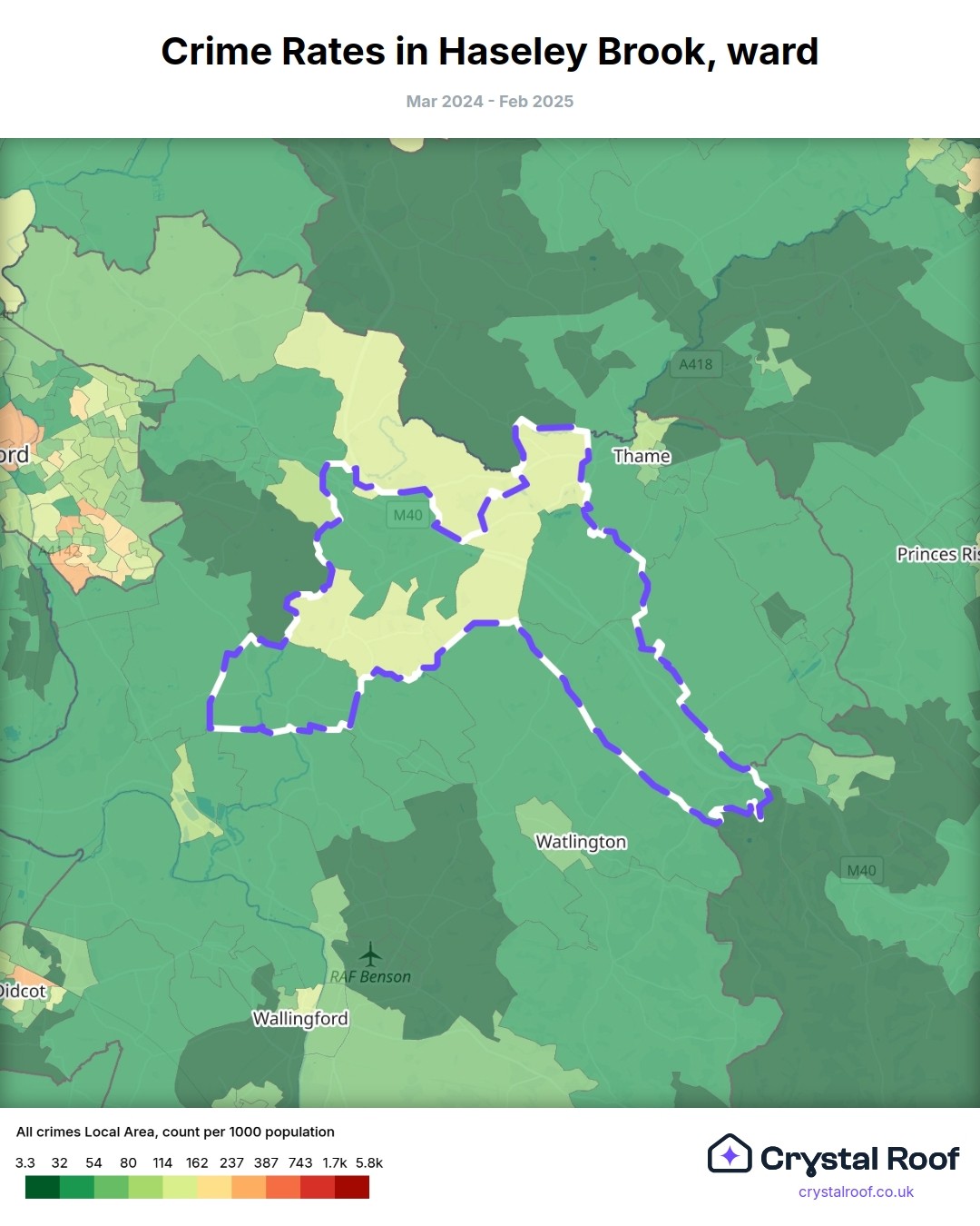 Haseley Brook (ward) is located within South Oxfordshire (borough). Annual total crime rate in South Oxfordshire (borough) is 49.6 crimes per thousand resident population, which can be rated as 1 out of 10 or low crime level compared to other local authority districts in England and Wales.