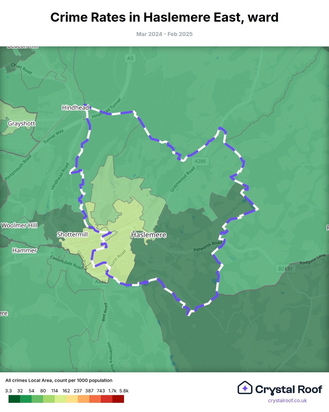 Haslemere East, (ward) includes areas with the following crime ratings (see map):