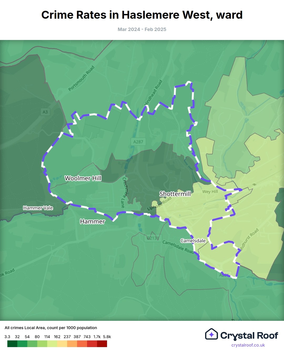 Haslemere West, (ward) includes areas with the following crime ratings (see map):