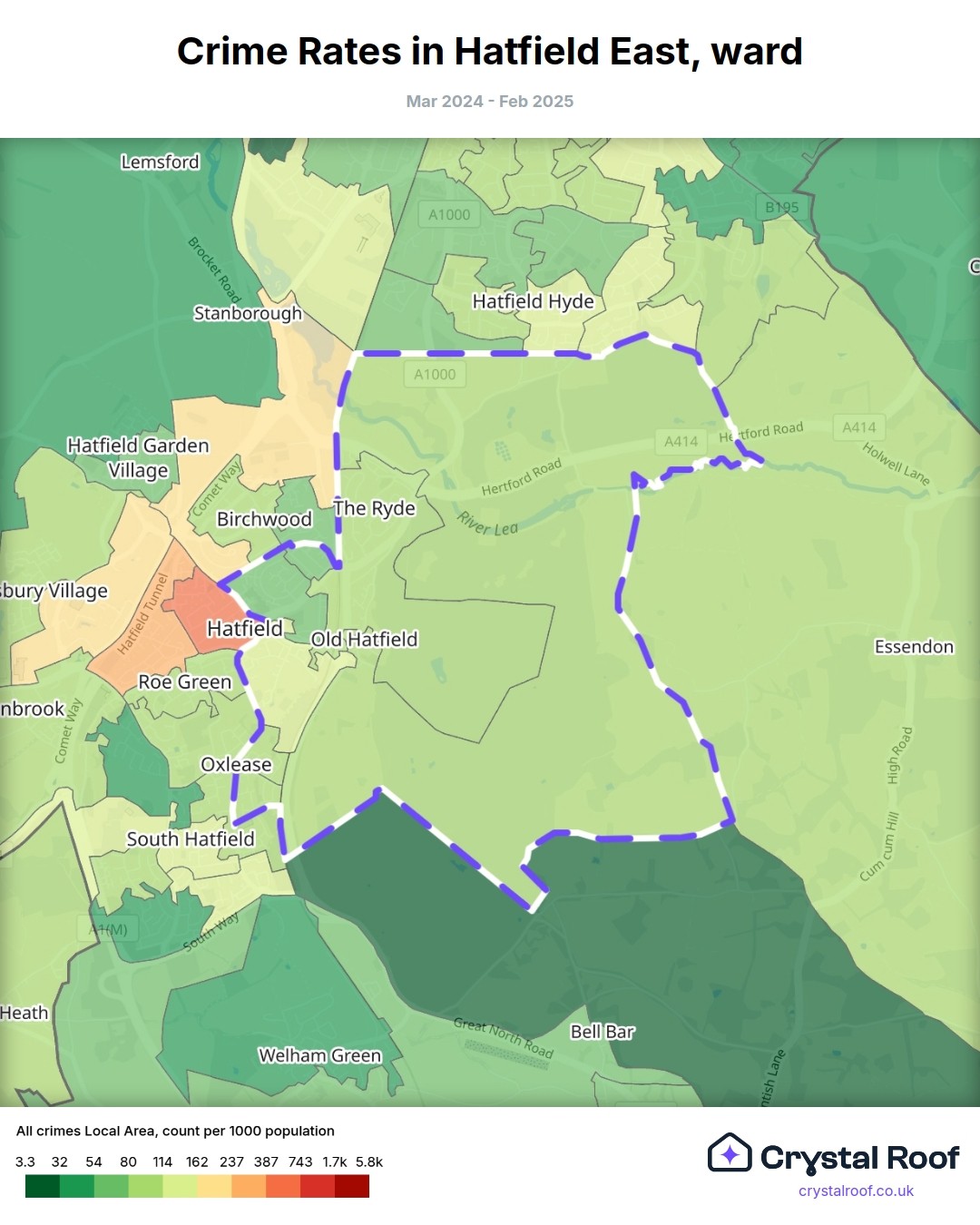 Hatfield East, (ward) includes areas with the following crime ratings (see map):