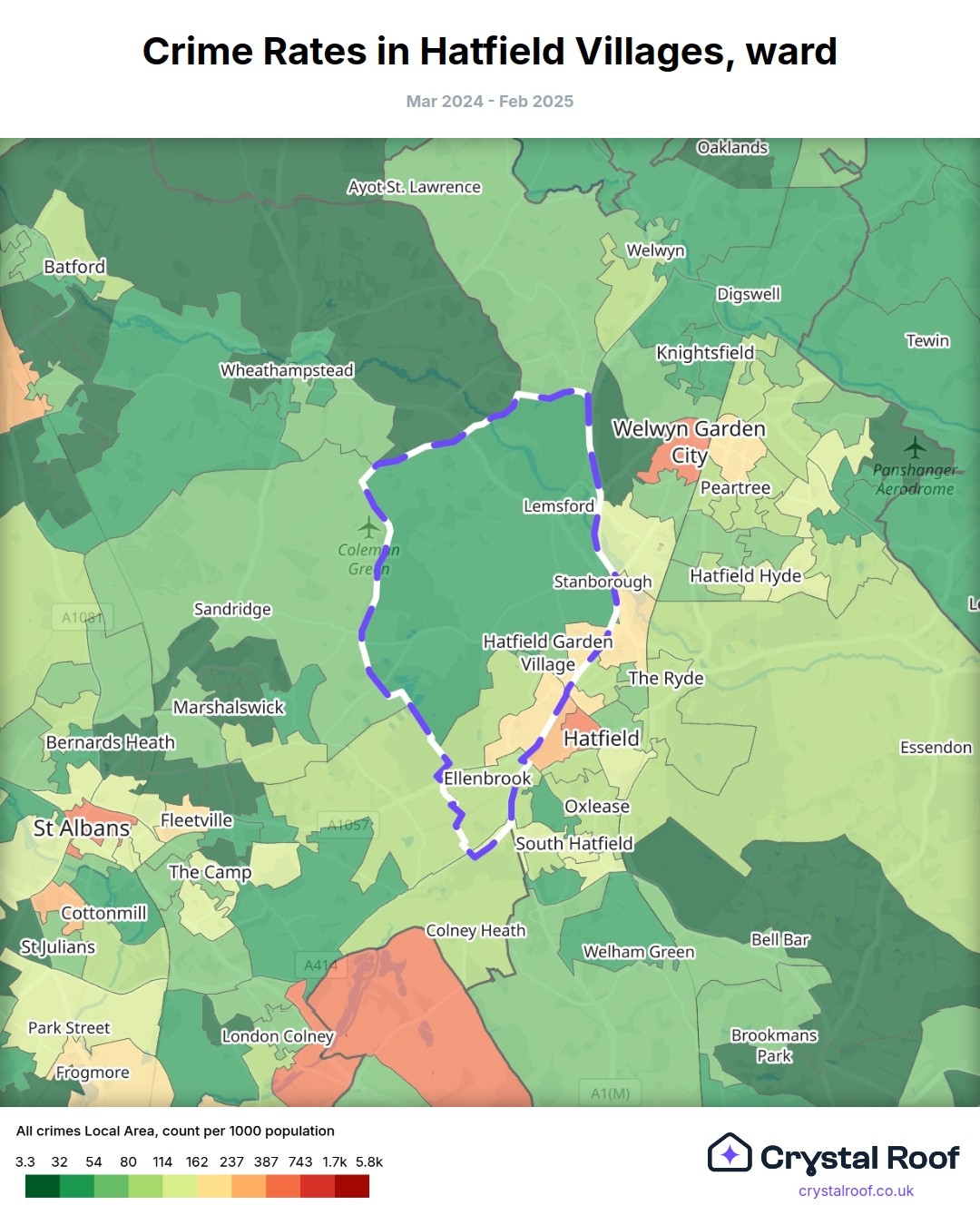 Hatfield Villages, (ward) includes areas with the following crime ratings (see map):