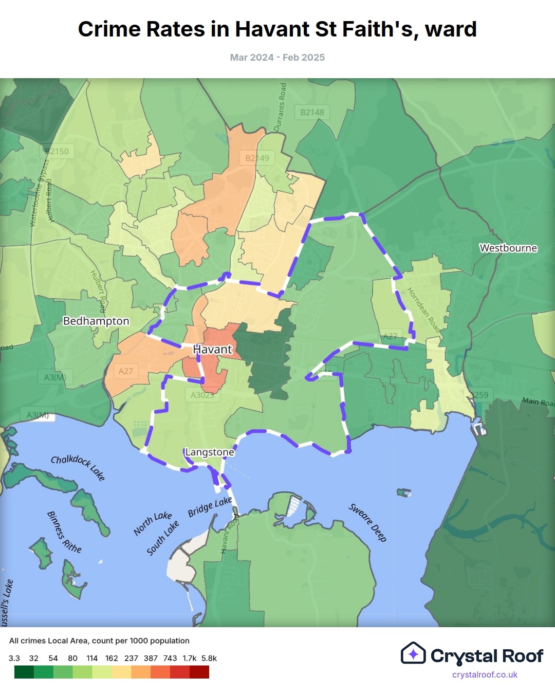 Havant St Faith's, (ward) includes areas with the following crime ratings (see map):