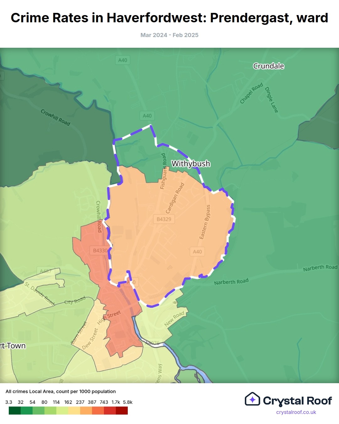 Annual total crime rate in Haverfordwest: Prendergast (ward) is 245 per thousand resident population. This can be rated as 7 out of 10 or high crime level compared to other wards in England and Wales.