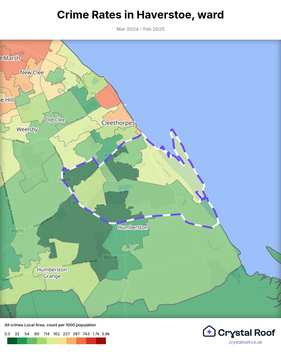 Haverstoe (ward) is located within North East Lincolnshire (borough). Annual total crime rate in North East Lincolnshire (borough) is 125 crimes per thousand resident population, which can be rated as 6 out of 10 or medium crime level compared to other local authority districts in England and Wales.