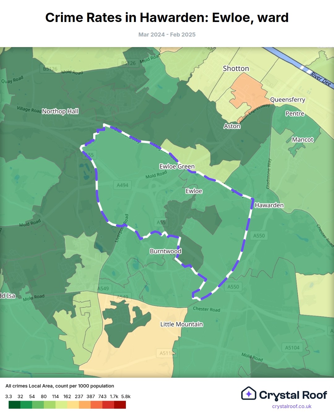 Hawarden: Ewloe, (ward) includes areas with the following crime ratings (see map):