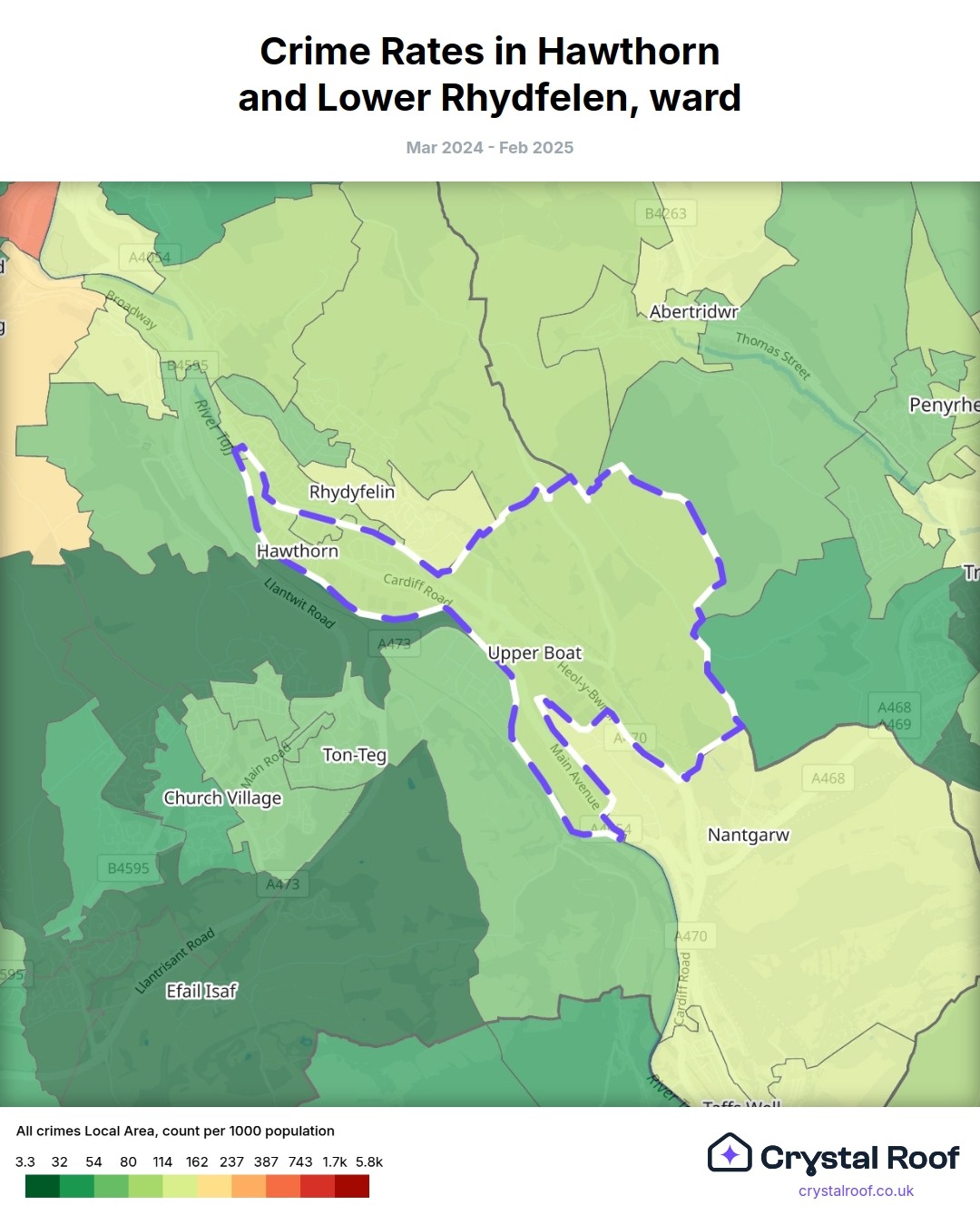 Hawthorn and Lower Rhydfelen, (ward) includes areas with the following crime ratings (see map):