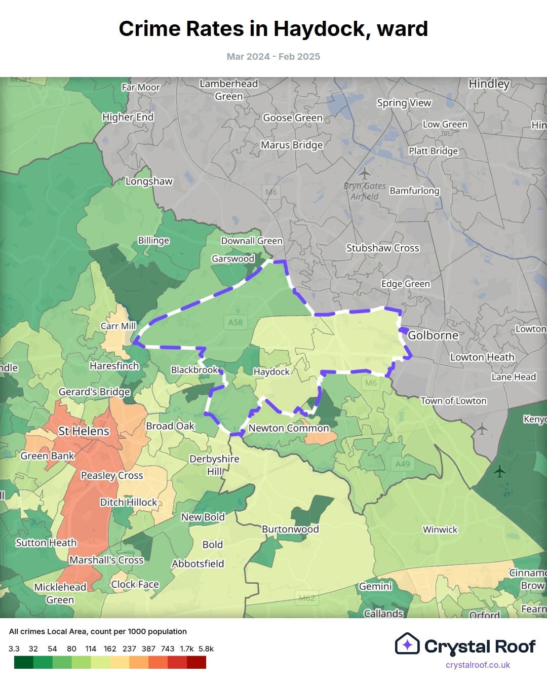 The figures in grey indicate the relative ratings of Haydock (ward) for a specific crime type compared to other wards in England and Wales.