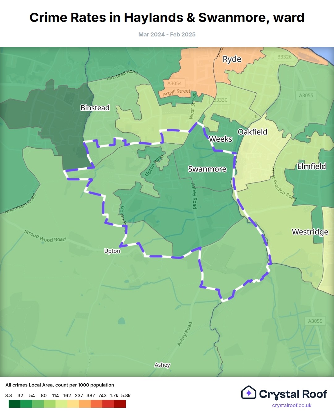 Haylands & Swanmore, (ward) includes areas with the following crime ratings (see map):
