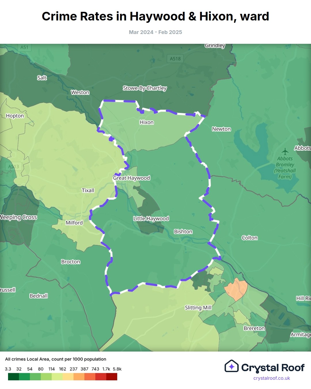 Historical crime rates in Haywood & Hixon (ward), Stafford (local authority district) and West Midlands (region)