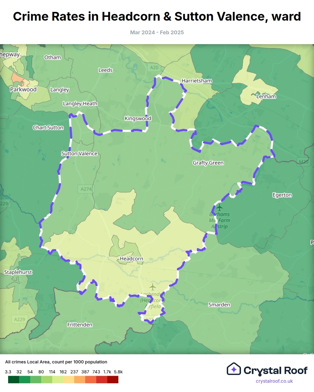 Headcorn & Sutton Valence, (ward) includes areas with the following crime ratings (see map):