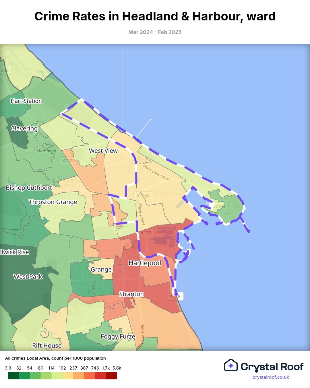 Headland & Harbour (ward) is located within Hartlepool (borough). Annual total crime rate in Hartlepool (borough) is 171 crimes per thousand resident population, which can be rated as 8 out of 10 or high crime level compared to other local authority districts in England and Wales.