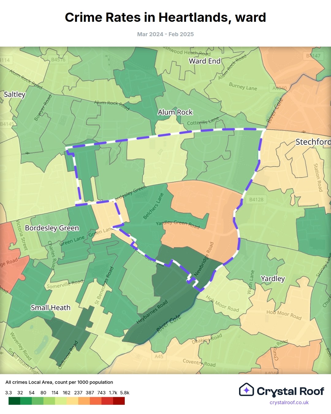 The figures in grey indicate the relative ratings of Heartlands (ward) for a specific crime type compared to other wards in England and Wales.