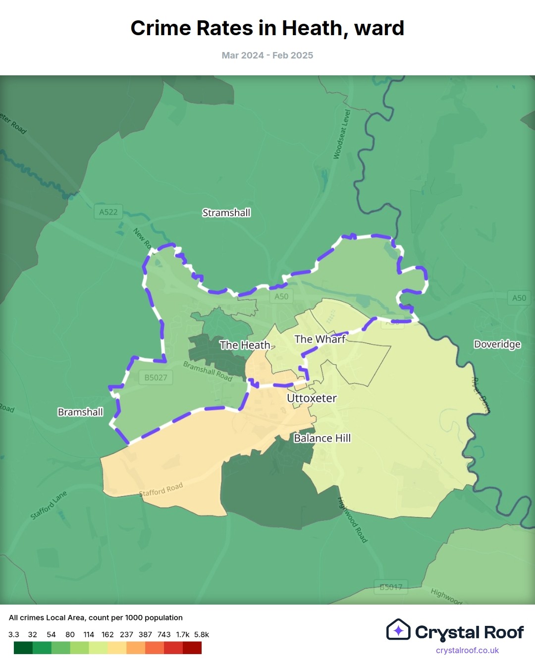 Heath (ward) is located within East Staffordshire (borough). Annual total crime rate in East Staffordshire (borough) is 77.6 crimes per thousand resident population, which can be rated as 3 out of 10 or low crime level compared to other local authority districts in England and Wales.