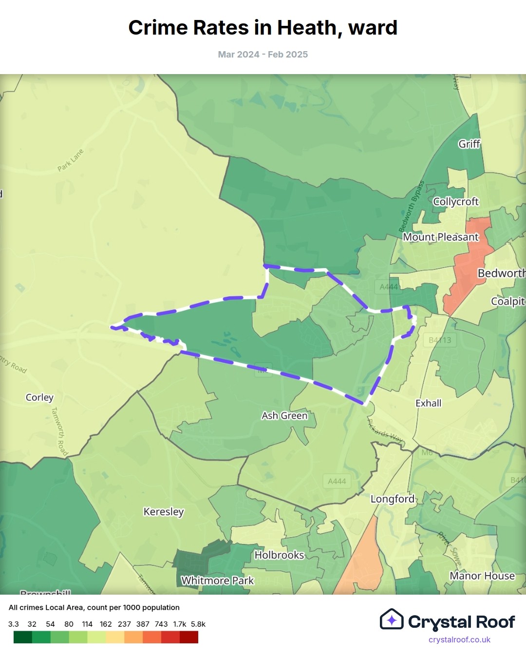 Heath (ward) is located within Nuneaton and Bedworth (borough). Annual total crime rate in Nuneaton and Bedworth (borough) is 110 crimes per thousand resident population, which can be rated as 5 out of 10 or medium crime level compared to other local authority districts in England and Wales.
