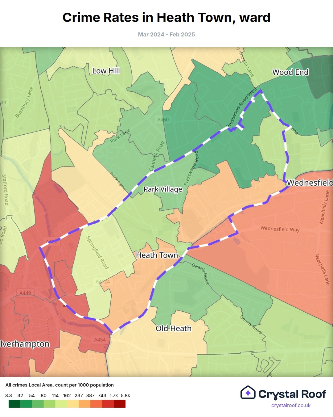 Heath Town, (ward) includes areas with the following crime ratings (see map):