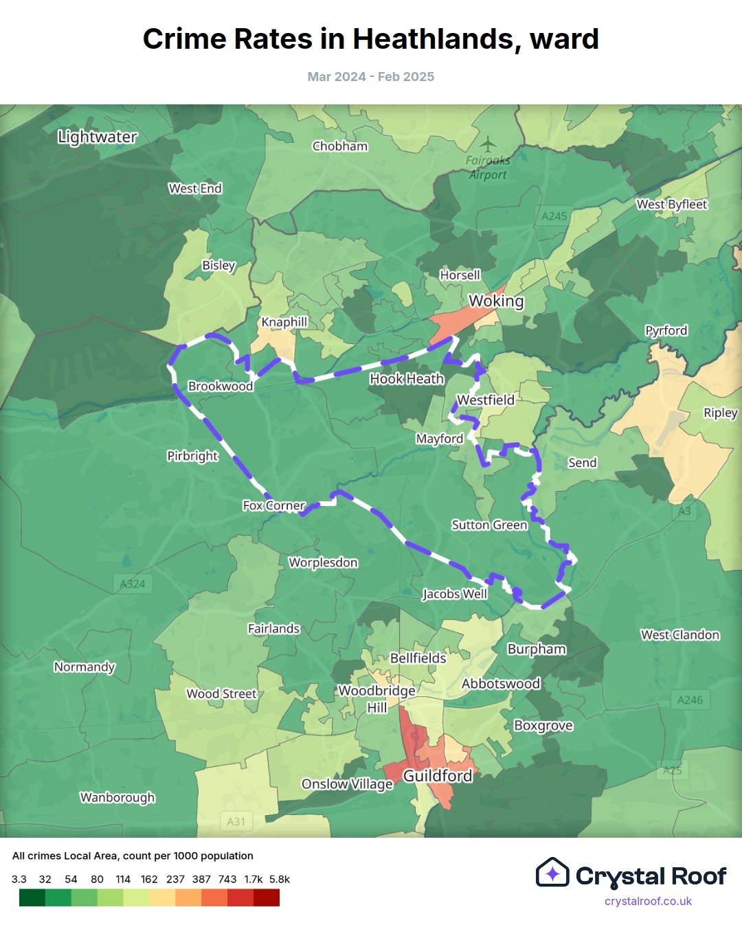 Heathlands (ward) is located within Woking (borough). Annual total crime rate in Woking (borough) is 75.6 crimes per thousand resident population, which can be rated as 3 out of 10 or low crime level compared to other local authority districts in England and Wales.
