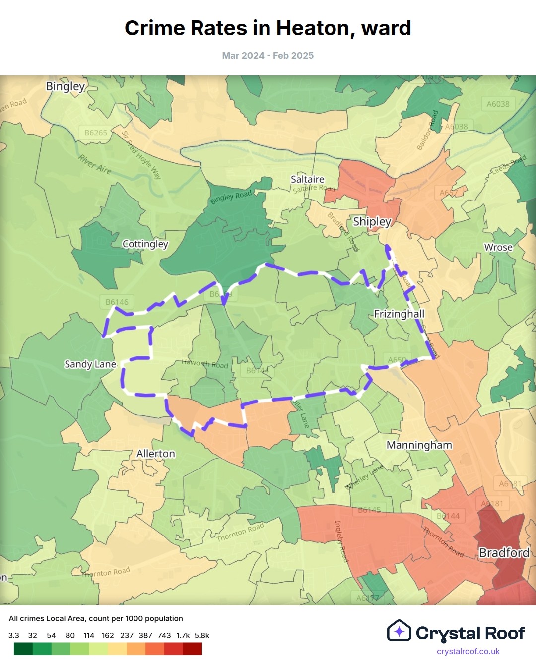 Heaton (ward) is located within Bradford (borough). Annual total crime rate in Bradford (borough) is 139 crimes per thousand resident population, which can be rated as 7 out of 10 or high crime level compared to other local authority districts in England and Wales.