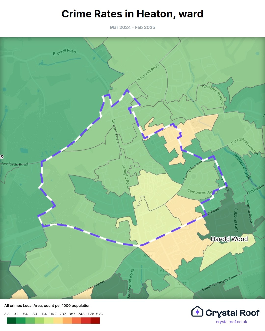 Heaton (ward) is located within Havering (borough). Annual total crime rate in Havering (borough) is 92.9 crimes per thousand resident population, which can be rated as 4 out of 10 or low crime level compared to other local authority districts in England and Wales.