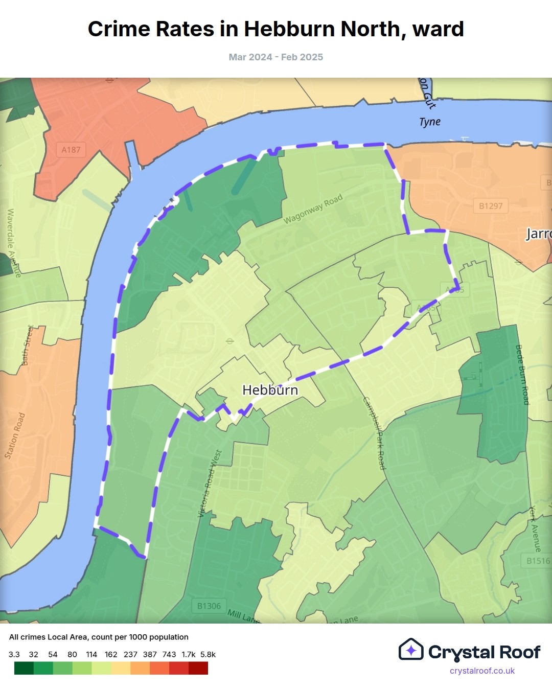 Hebburn North, (ward) includes areas with the following crime ratings (see map):