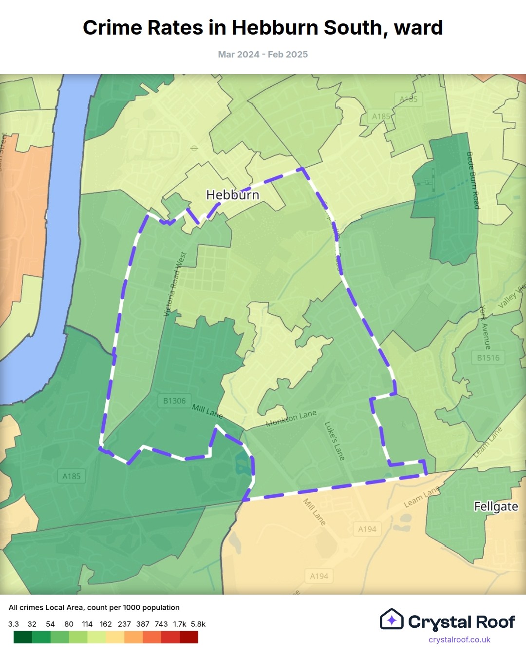 Hebburn South, (ward) includes areas with the following crime ratings (see map):